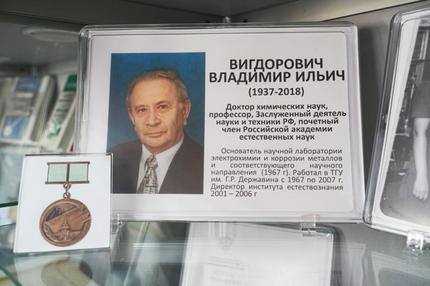 Лаборатории электрохимии и коррозии металлов Державинского университета присвоили имя д.х.м., профессора ТГУ, заслуженного деятеля науки и техники РФ Владимира Вигдоровича (1937-2018 гг.). Ученый проработал в Тамбовском госуниверситете более 40 лет. Он развивал вместе с д.х.м., профессором ТГУ Людмилой Цыганковой научное направление «Электрохимия и коррозия металлов в неводных средах». Позднее под их руководством стали появляться и другие направления: научные основы и практика создания универсальных ингибиторов коррозии металлов; теоретические основы наводороживания металлов; научные основы и практика создания малокомпонентных антикоррозионных материалов для защиты металлов от атмосферной коррозии.